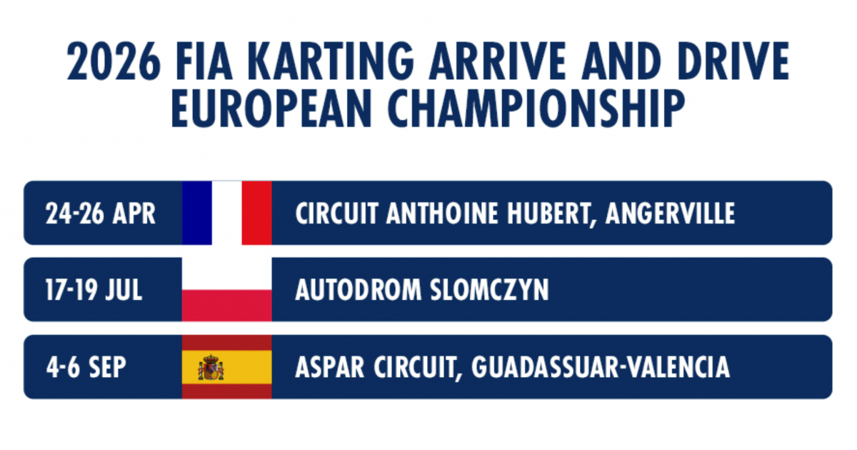 FIA Karting Arrive and Drive -yksilöilmoittautumiset ensimmäiseen koskaan järjestettävään FIA Karting Arrive and Drive Euroopan Maanosamestaruuteen avautuvat 13. helmikuuta 2026 ja ovat auki 1. huhtikuuta 2026 saakka. Maanosamestaruus, joka on kulmakivi FIA:n Global Karting Plan -ohjelmassa, koostuu kolmesta osakilpailusta ajanjaksolla huhtikuu–syyskuu 2026. FIA:n suosima Arrive and Drive -formaatti edistää edullista, helposti saavutettavaa ja osallistavaa autourheilua, jossa tekninen ja taloudellinen tasavertaisuus palkitsee yksilöllistä ajotaitoa ja lahjakkuutta.